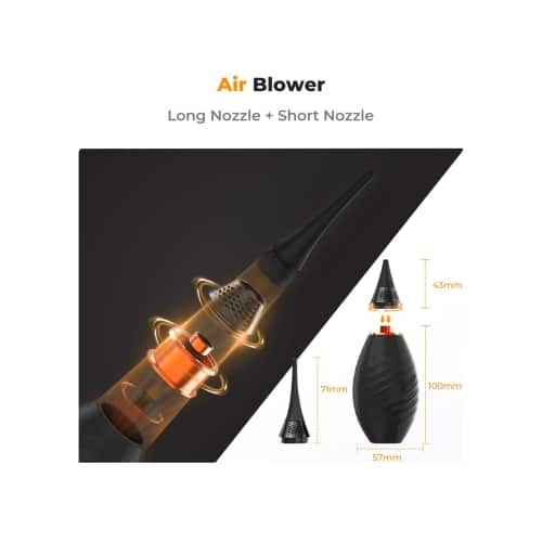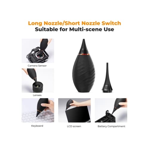 O K&F CONCEPT Soprador KF08.041 vem com duas pontas – uma longa e uma curta. A ponta longa é adequada para limpar áreas mais profundas, como sensores DSLR e compartimentos de bateria da câmera. A ponta curta é adequada para limpar lentes, filtros, sensores sem espelho, superfícies corporais e lentes.