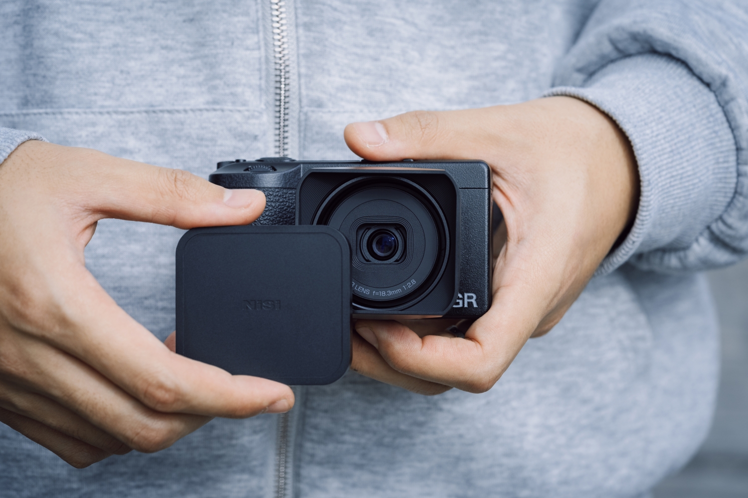 - Kit dedicado para Ricoh GR IV com adaptador 49mm, parasol e tampa magnética.