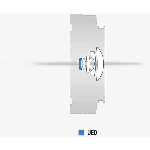 A configuração otimizada possui 5 elementos em 5 grupos, incluindo 1 lente UED para minimizar aberrações e garantir uma resolução excelente.