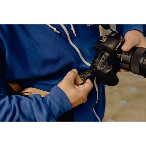 - Liga-se às presilhas da correia ou à parte inferior do corpo da câmara através do hardware de montagem de âncora de perfil ultra baixo