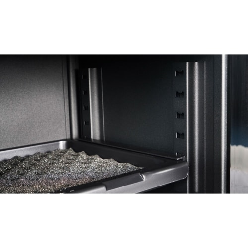 Este modelo HC50S também oferece uma prateleira ajustável e dois forros de espuma para organizar e proteger os seus itens de possíveis riscos ou impactos. O sistema de controlo mantém os níveis de humidade relativa por até 24 horas após a interrupção da energia, sendo ideal para armazenamento de equipamentos sensíveis como lentes fotográficas, joias, produtos eletrónicos e outros objetos de valor.