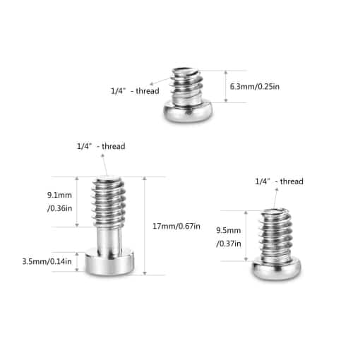 Este pacote de parafusos hexagonais de 1/4 ” inclui 4 peças de parafusos padrão (comprimento de rosca de 1/4 ”, usado na maioria das gaiolas de câmera SmallRig, como a gaiola VersaFrame 1584), 8 peças de parafusos longos (comprimento de rosca de 3/8 ”, usado na montagem da Plate Perfurada Multifunções 1598, railblock 942, trilho NATO 1195, etc) e uma chave hexagonal.