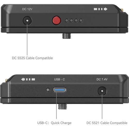 - A placa é montada no equipamento ou na cage da câmara utilizando o parafuso de 1/4″-20 incluído. Inclui um botão de alimentação e indicadores LED de estado da bateria na parte lateral. A porta USB-C de entrada/saída de 36 W pode alimentar uma câmara ou acessório e também pode ser utilizada para carregar a bateria montada. Existem saídas de barril de 12 e 7,4 V que também podem alimentar a sua câmara ou acessório, e todas as portas possuem proteção de circuito para evitar danos no seu equipamento.