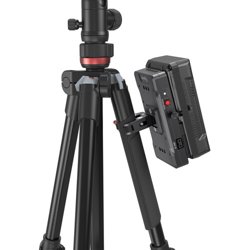 A placa de alumínio durável apresenta várias roscas de 1/4″-20 na parte traseira para montá-la numa variedade de braços, cages, grampos, slides ou plataformas. O grampo em forma de caranguejo anexado permite prender a placa em hastes de 15 a 30mm de diâmetro. A placa também possui um botão de alimentação na lateral, para que possa cortar rapidamente a energia da bateria.