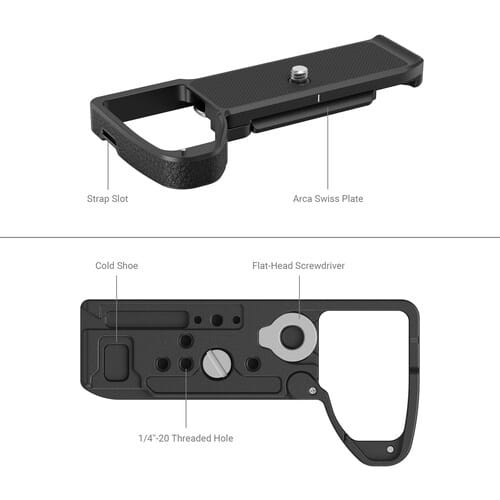 A sapata SmallRig para Sony Alpha 7 IV tem como objetivo melhorar a experiência de utilização com tripé e com a mão enquanto protege a parte inferior da câmara. Na parte inferior da câmara está um parafuso de 1/4″-20 e um pino de localização, com recursos de almofada de silicone integrada para evitar arranhões e torções. Uma chave de fuso na porta da bateria que se ajusta à curva da câmera para um manuseamento confortável. Incorpora couro genuíno selecionado na placa de base e integra-se ao corpo da câmera. Orifícios roscados de 1/4″-20 e sapatas frias na parte inferior suportam minitripés e microfones. A sapata é compatível com Arca. Uma chave magnética embutida acessível facilita a desmontagem e montagem.
