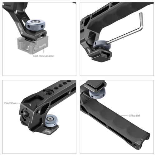 O punho ergonómico, com silicone antiderrapante e resistente ao frio, oferece uma sensação confortável e pesa apenas 129g devido ao seu design oco. Possui 3 cold shoes frontais e 2 traseiros, permitindo a montagem simultânea de microfones, luzes LED, monitores e outros acessórios. Orifícios de localização ARRI 3/8″ -16 suportam os suportes de monitor 2903 e 2348; orifícios roscados 1/4″-20 são compatíveis com o braço mágico 2070 para monitores e o controlo remoto 2924 para gravação. Uma chave Allen está incluída para apertar o parafuso de bloqueio, facilitando a montagem e desmontagem.