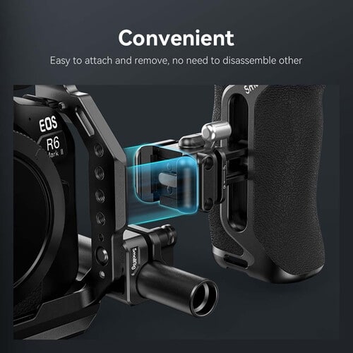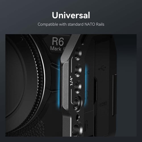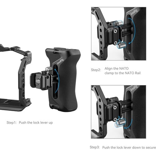 - Capaz de se fixar à cage da câmara com um simples “clique”, este punho lateral SmallRig de encaixe rápido e bloqueio rápido NATO oferece um punho do lado direito ou esquerdo com pontos de montagem adicionais para o seu equipamento. O grampo NATO de bloqueio rápido pode fixar o punho a qualquer calha NATO compatível para uma instalação fácil. O Punho pode ainda ser ajustada verticalmente em 1,4″ para obter um equilíbrio ótimo.