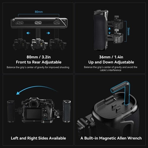 - Várias roscas de 1/4″-20 e uma ranhura de montagem de sapata na parte superior do punho oferecem locais para fixar a sua luz de preenchimento, monitor externo ou abraçadeira de cabo. Existe ainda uma ranhura para a correia de pulso para segurança adicional. O Punho é construído em liga de alumínio e tem uma capacidade de carga de 12 kg para equipamentos mais pesados. Uma chave Sextavado magnética incorporada facilita a fixação e a remoção de acessórios.