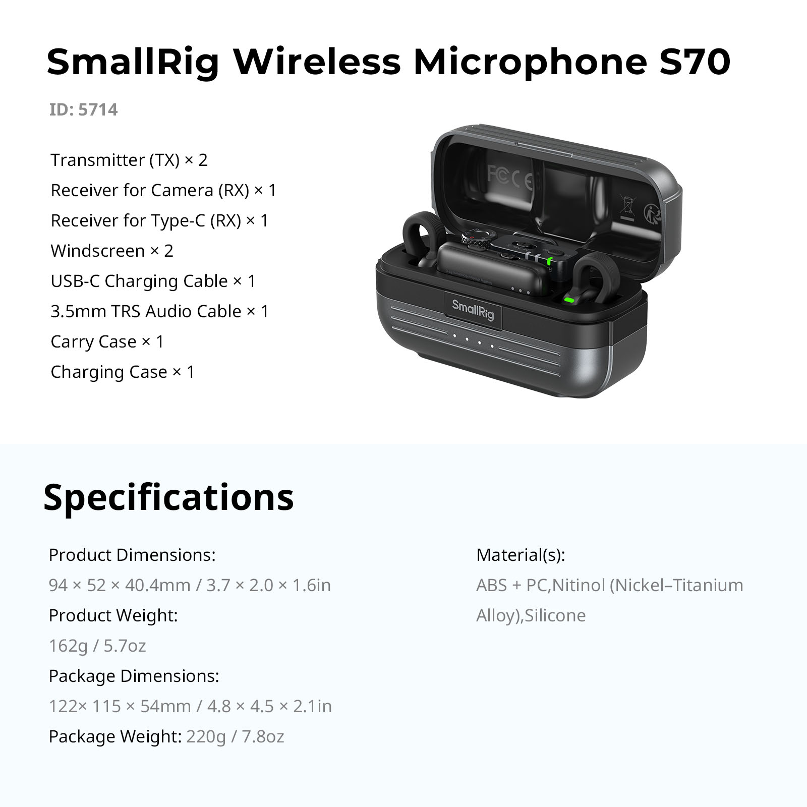 SMALLRIG 5714 S70-A Microfone Wireless 2 Pessoas – USB-C / Lightning / Câmara