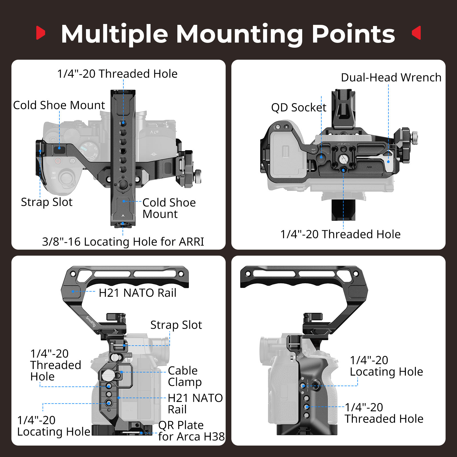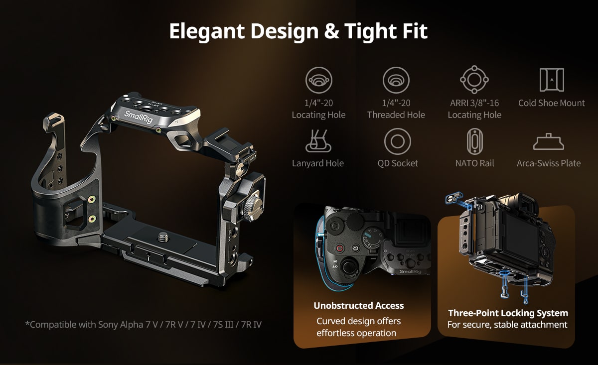 O SMALLRIG 6025 Cage Kit é uma solução completa de rigging concebida para maximizar o potencial das câmaras Sony Alpha A7 V, A7R V e A7 IV em produções de vídeo profissionais.