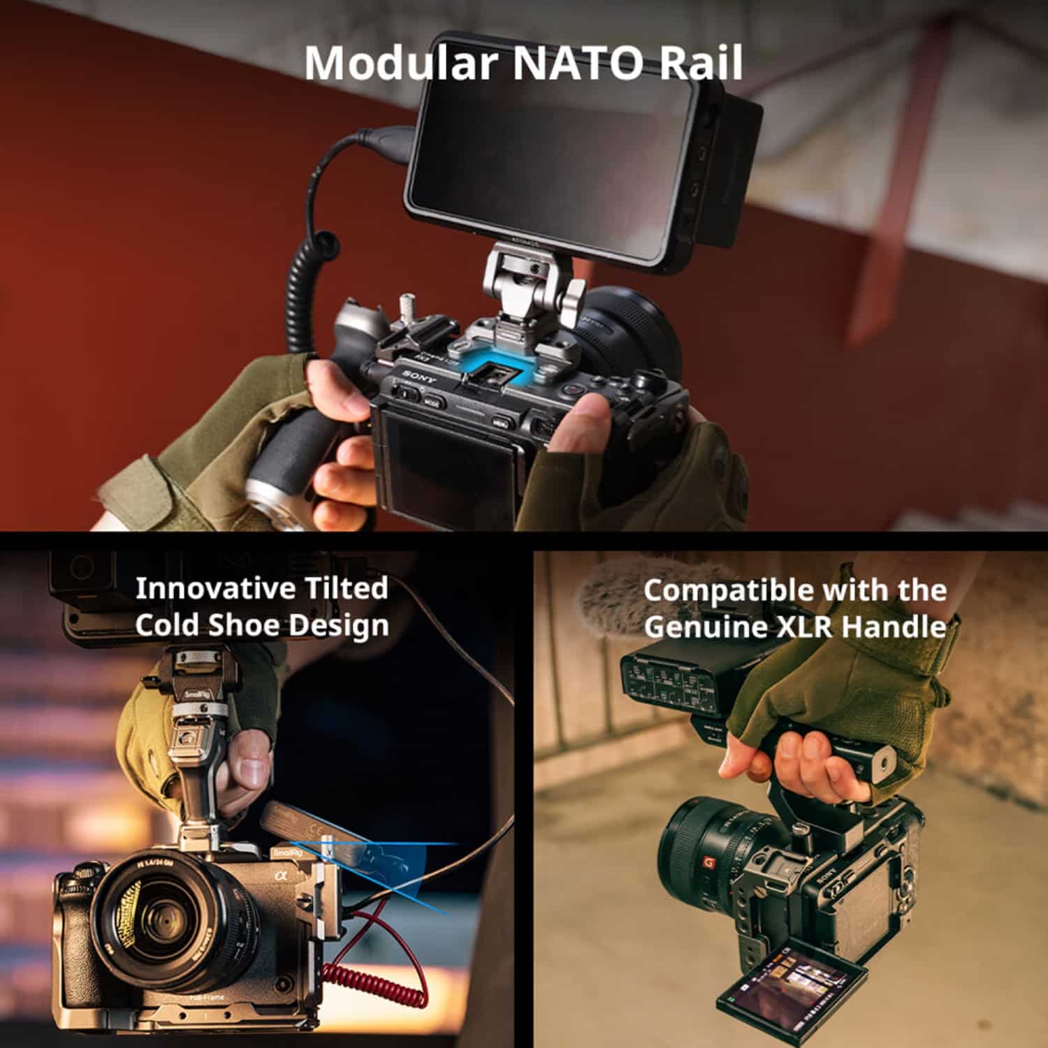 O trilho NATO superior removível proporciona compatibilidade com a pega XLR original da Sony ou outros acessórios que requeiram acesso total à sapata superior.