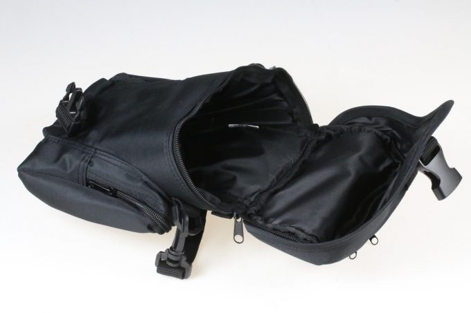 Para além do compartimento principal, esta bolsa dispõe de dois bolsos laterais e de um bolso adicional na tampa, ideais para guardar cartões de memória, baterias suplentes, cabos ou pequenos acessórios de forma organizada e segura.