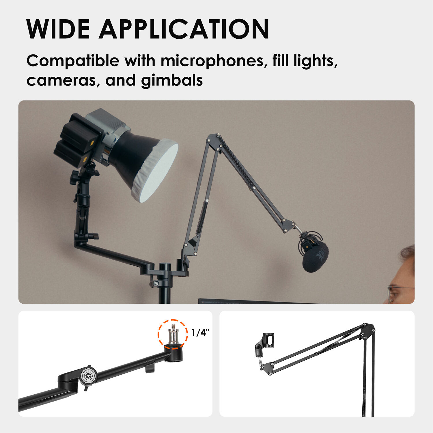 Graças aos dois pontos de articulação horizontais e um vertical, permite posicionar com precisão luzes LED, flashes de estúdio ou outros acessórios compatíveis com Baby-Pin 5/8″. O braço adicional articulado incluído oferece suporte dedicado para microfone, tornando-o ideal para setups de streaming, gravação de vídeo ou fotografia de produto.