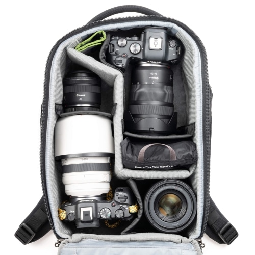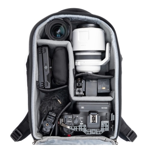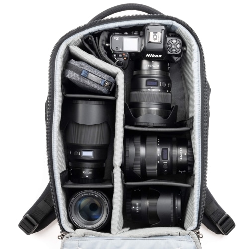 Grande capacidade para transporte de equipamento fotográfico, com acesso total pelo painel frontal para melhor organização e visualização.