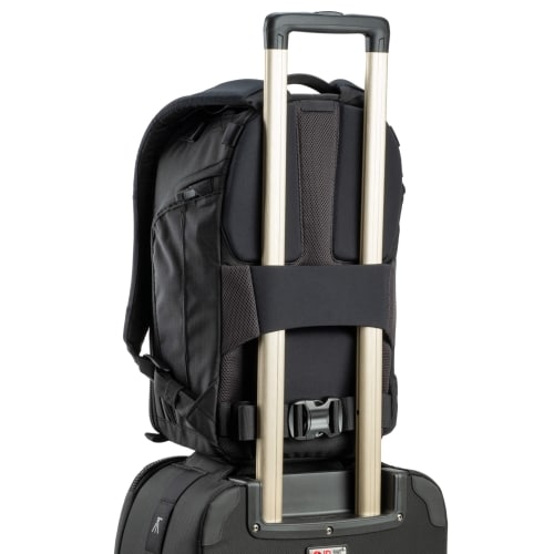Três opções de transporte de tripé: laterais com suporte através dos bolsos de garrafa de água ou suporte frontal para tripés maiores.
