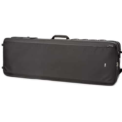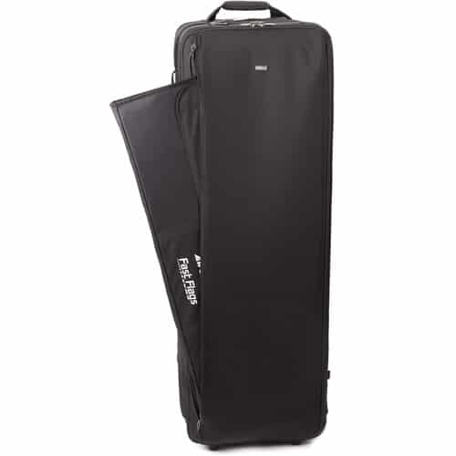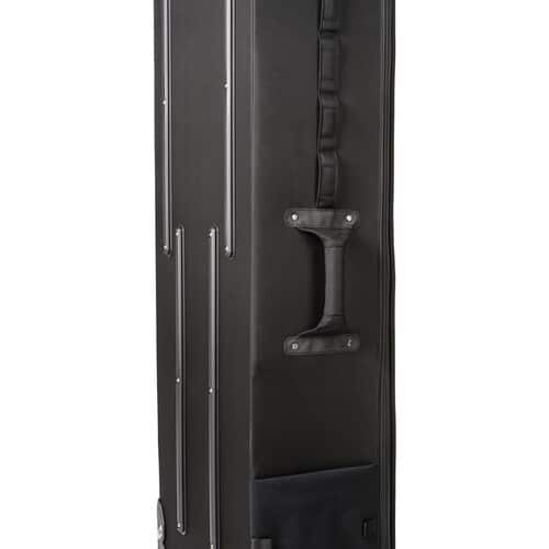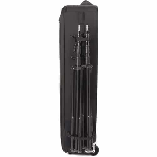 - Bolso deslizante de nylon balístico com aperto de bloqueio de escada e alças de retenção para suportes de luz ou tripés.