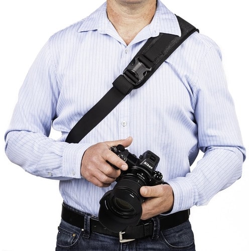 Pode ser utilizada uma correia de compressão no painel frontal, permitindo que um objeto maior, como um tripé ou um monopé, seja preso à funda enquanto está enfiado no bolso virado para a frente