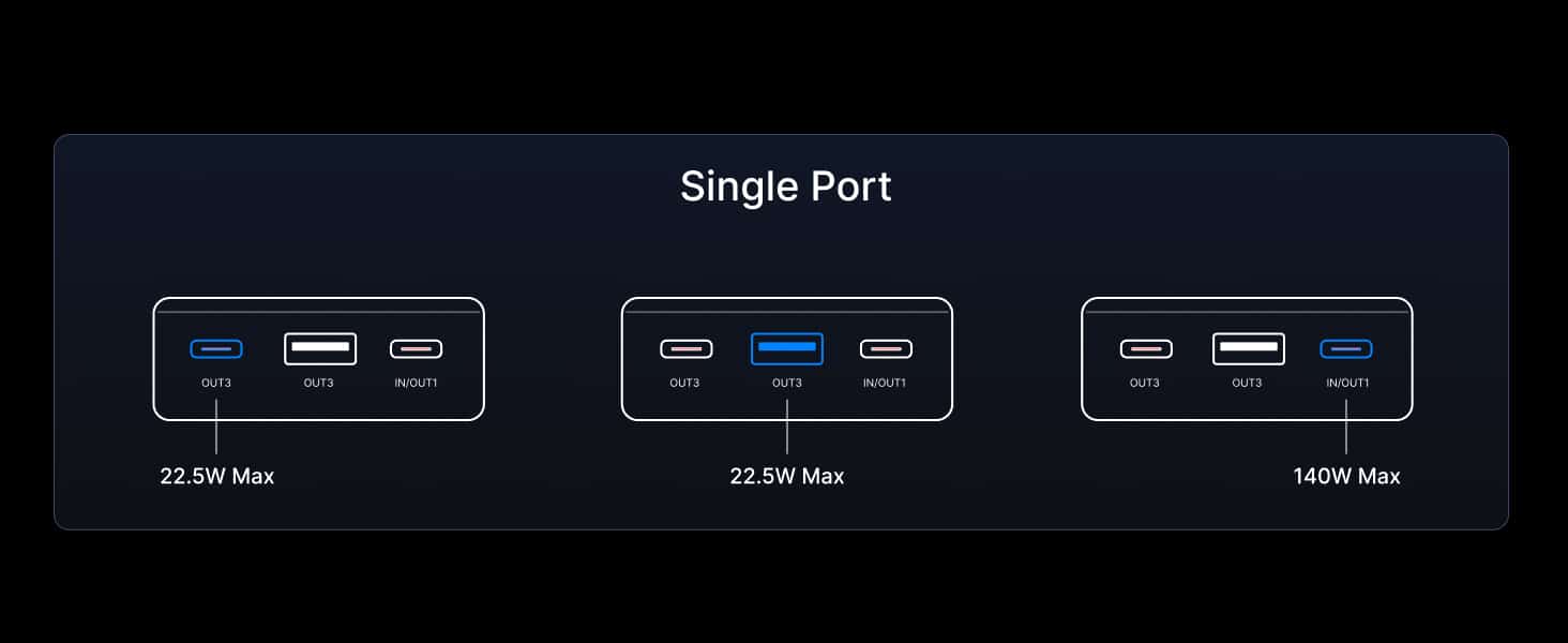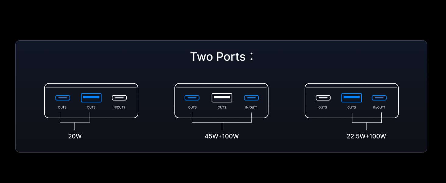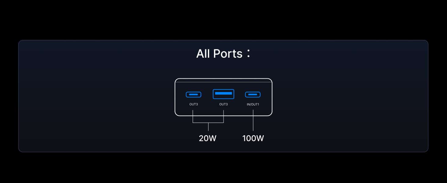 A porta USB-C principal fornece até 100 W de potência constante, mesmo quando as restantes portas estão em uso, enquanto a segunda porta USB-C disponibiliza até 45 W e a porta USB-A até 18 W. Esta configuração permite carregar até três dispositivos em simultâneo, mantendo elevada eficiência energética.