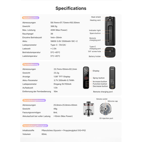 - Compatibilidade do Fluido: Fluido de fumo standard (ex. à base de água/glicerina)