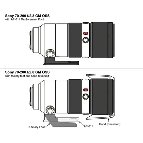 Projetado para a lente Sony FE 70-200mm f/2.8 GM OSS, o suporte com sapata de sistema arca-swiss AP-611 da Wimberley é de alumínio anodizado 6061 compatível com a maioria das cabeças de sistema arca-swiss. Ao substituir o suporte original de fábrica, o AP-611 adiciona rigidez e estabilidade e reduz a flexão e a vibração quando montado numa cabeça. O perfil inferior da sapata proporciona melhor equilíbrio quando montado numa cabeça.